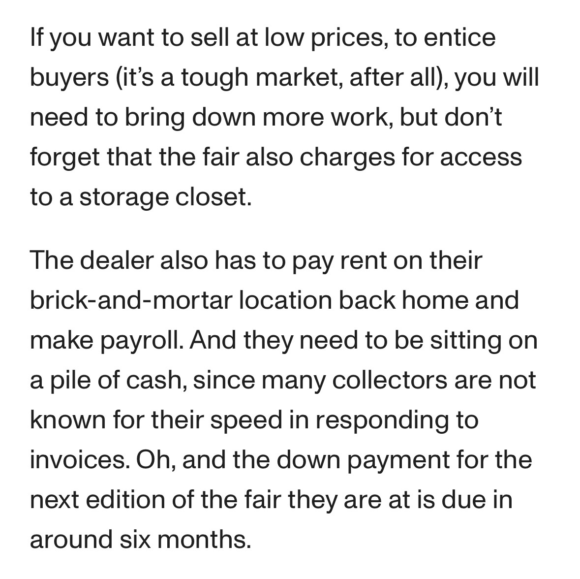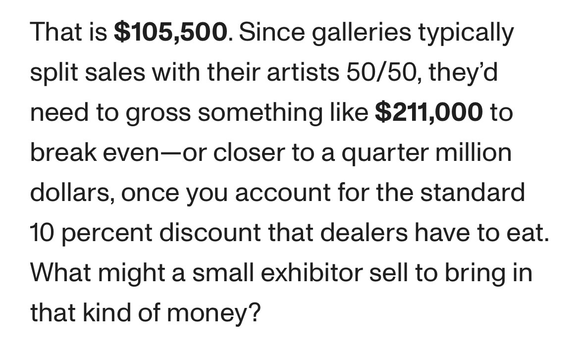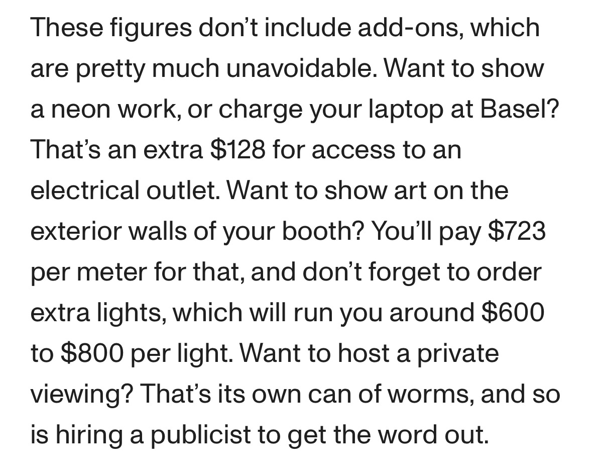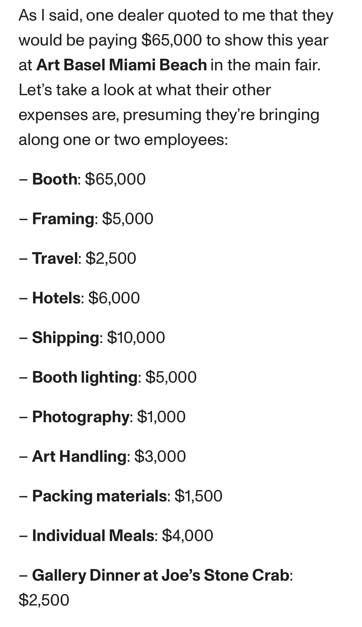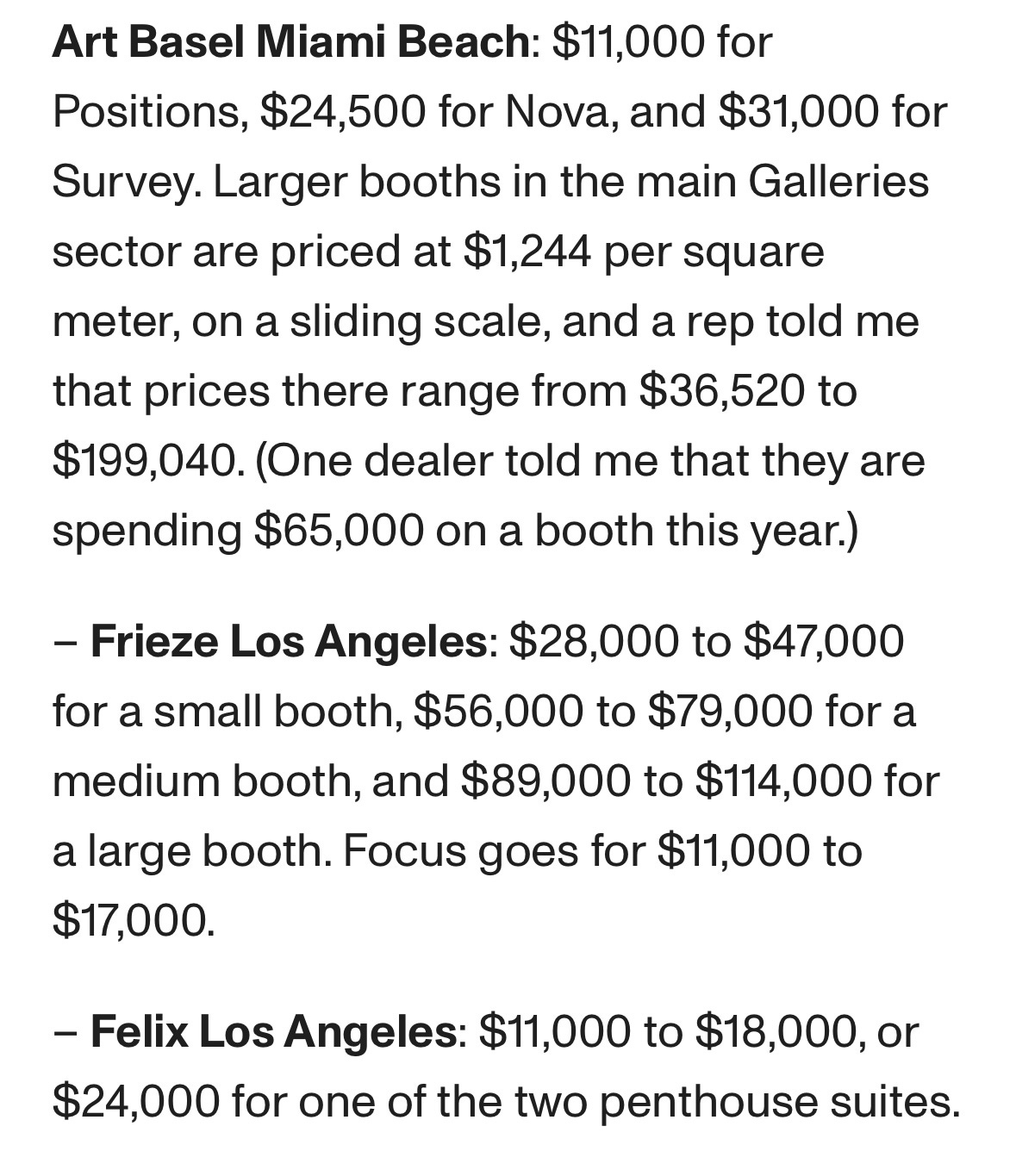 Anyways, I previously touched on the fact that I felt like the art world was fundamentally broken and incredibly lopsided in favour of like 5 big galleries. And pretty much everyone else (that is not money-laundering) seems to be really struggling right now. Even the big guys apparently. But then people are just persisting with the same systems and hoping that something sticks. Frieze LA, Basel Hong Kong, Expo Chicago, Frieze NY, Basel Basel, Armory Show, Frieze Seoul, Frieze London, Basel Paris, Basel Miami. Now Basel Qatar. This is the art fair calendar that most galleries in the “Global North” are following. If they’re not participating in the main fairs, some might participate in satellite fairs that happen in these cities around the same time. Honestly writing that list tired me out, let alone all the costs, planning and logistics that go into it. I took some screenshots of an Artnet article about the costs to appear in Art Basel Miami.